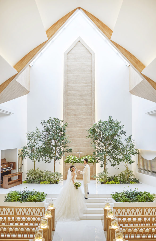 • 15mのバージンロード、天井高10mのチャペルで、圧巻の空間を演出しつつ、車いすの方にもやさしい